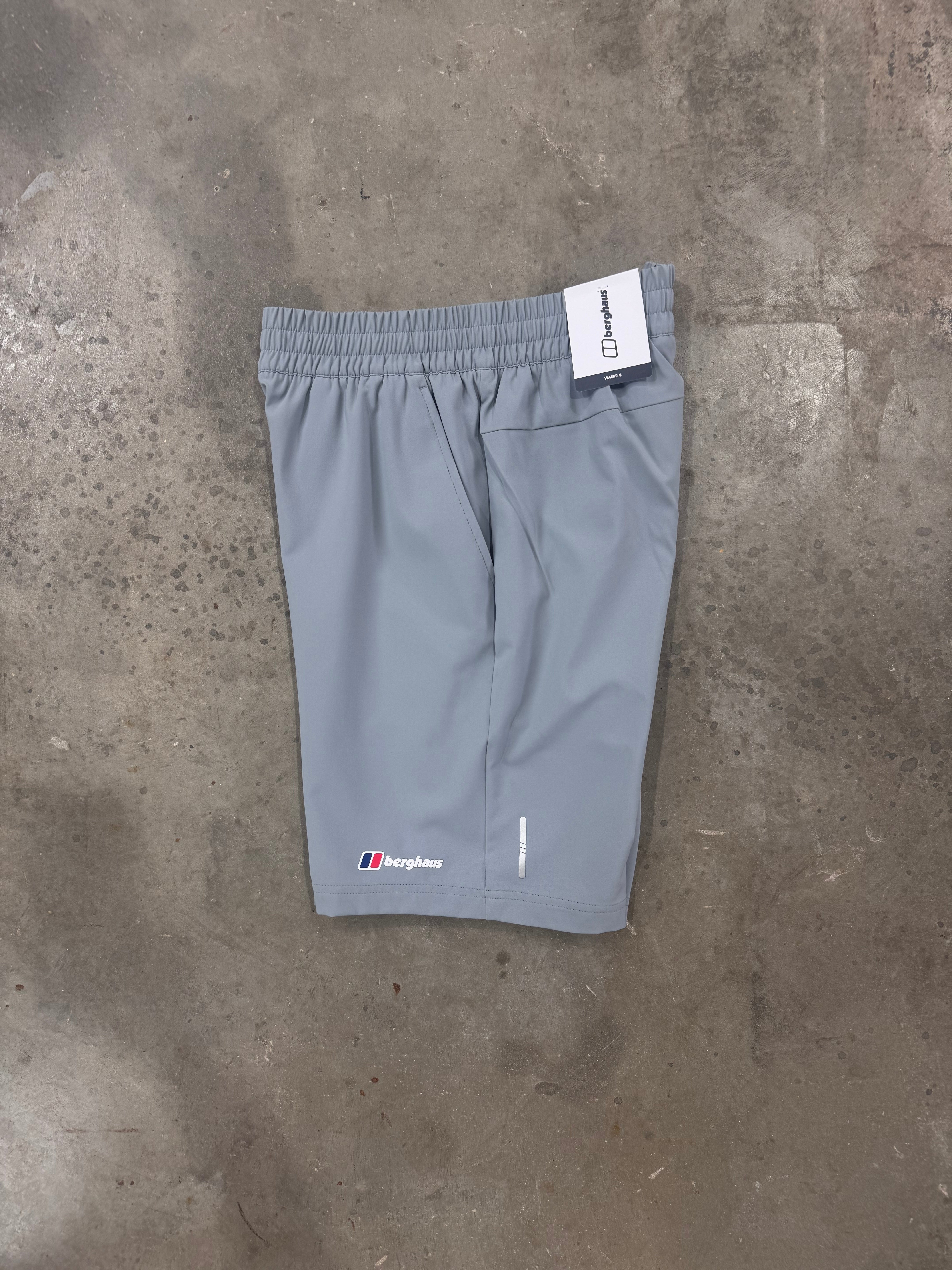 Berghaus Terrain Trek Shorts In Grey. An elasticated waistband with a drawstring fastening on the interior. Two mesh lined pouch pockets at the hips. The signature Berghaus logo is printed on the left lower thigh, with a smaller logo printed below the reverse waistband.