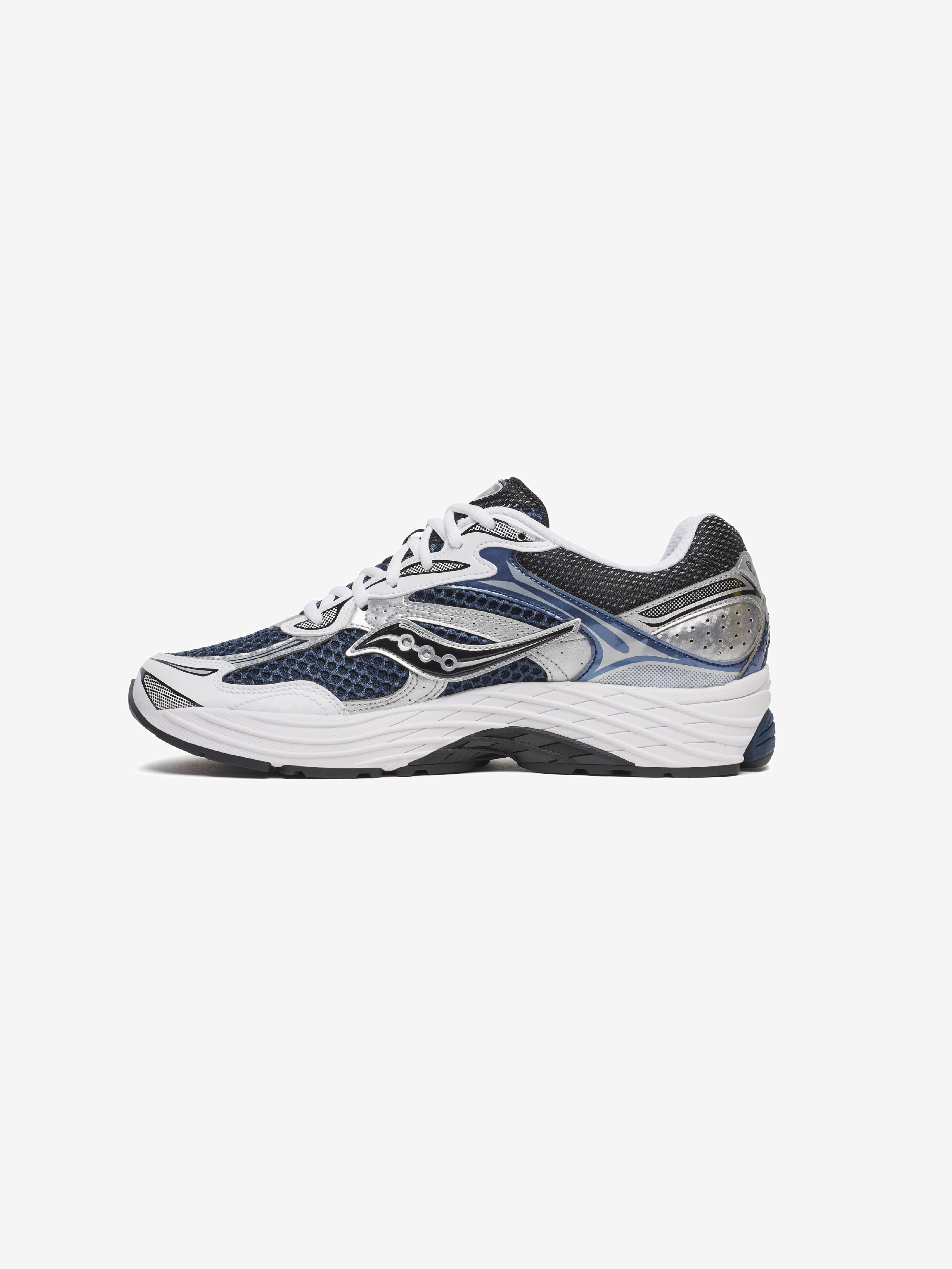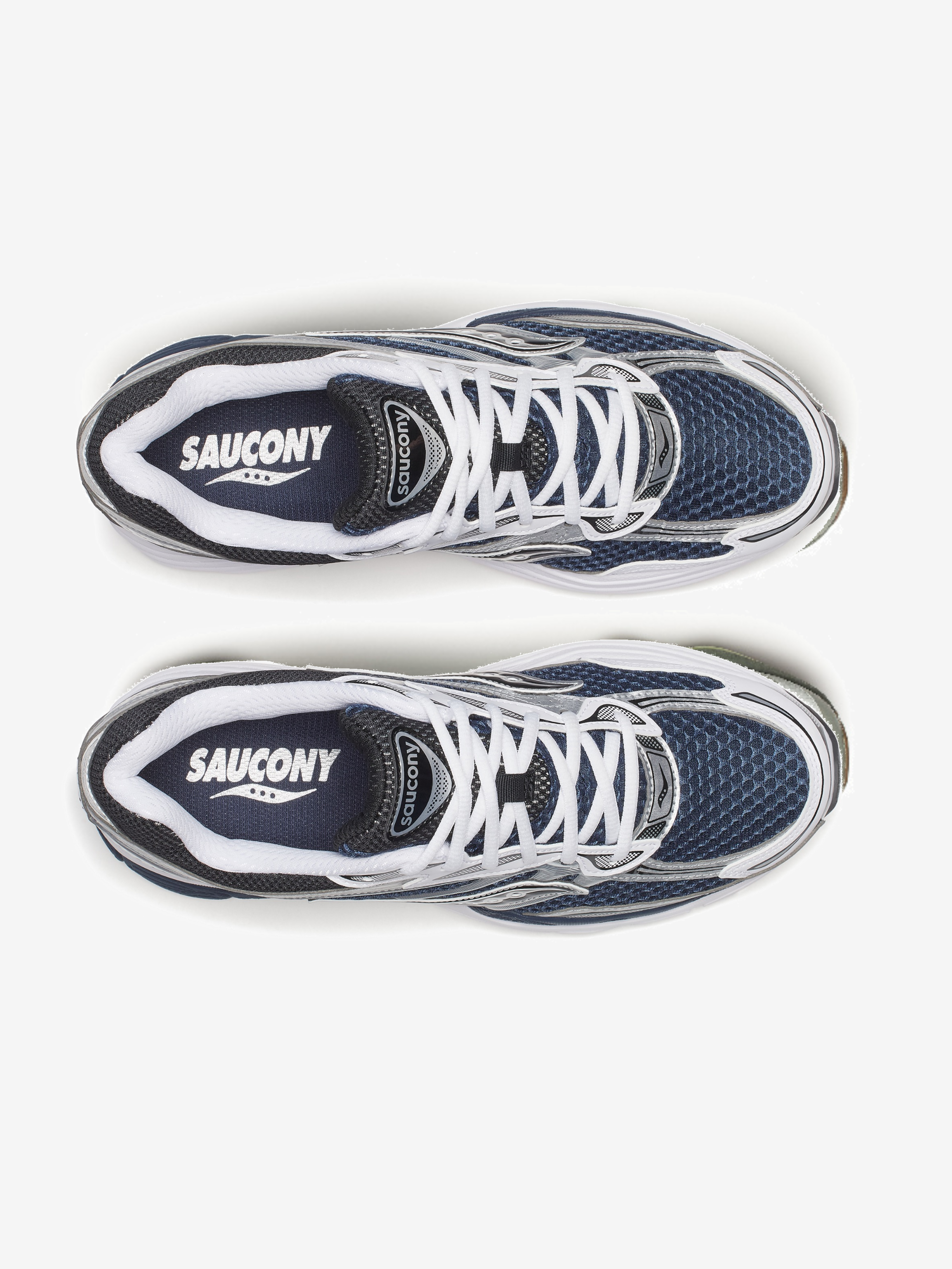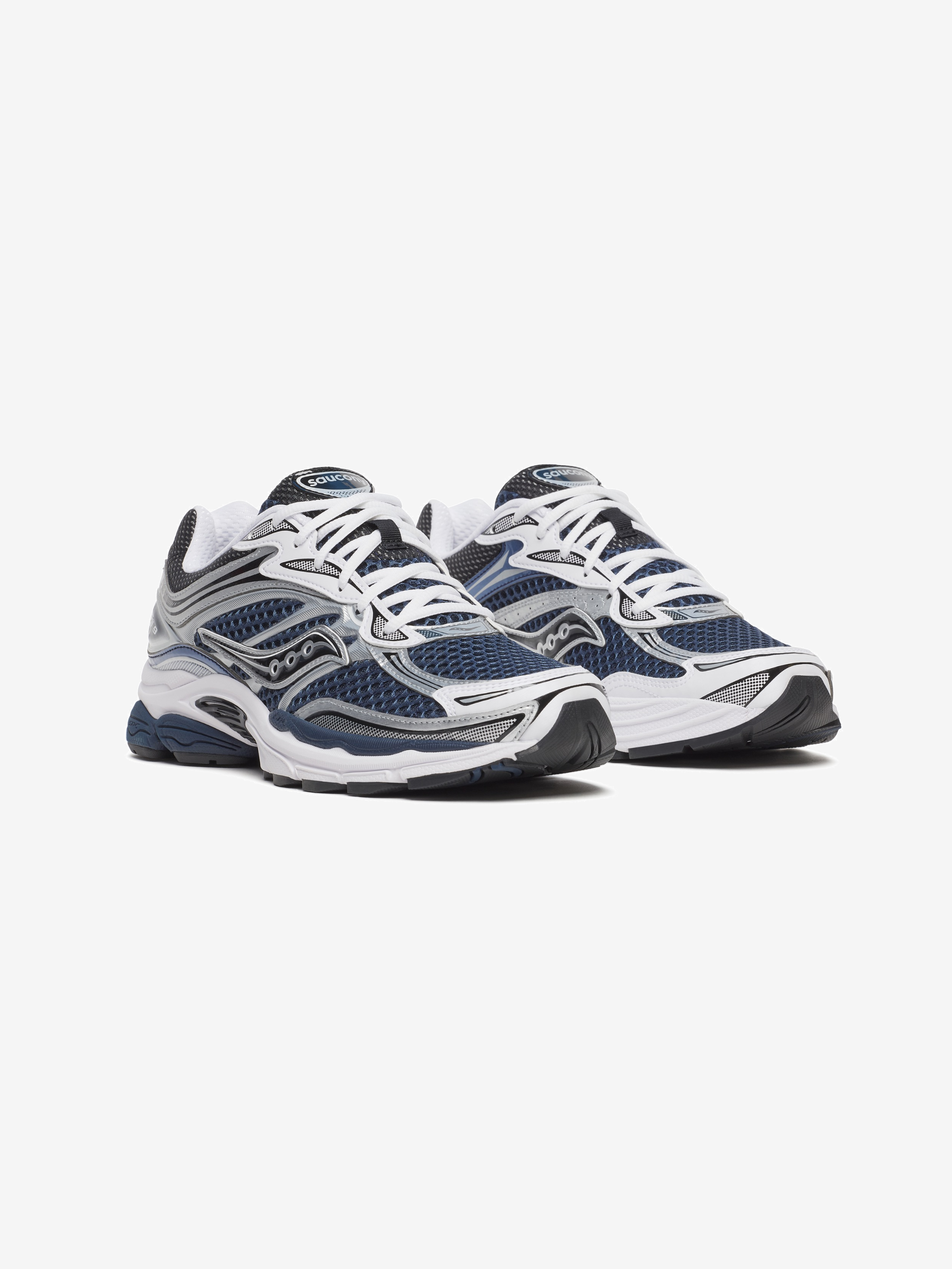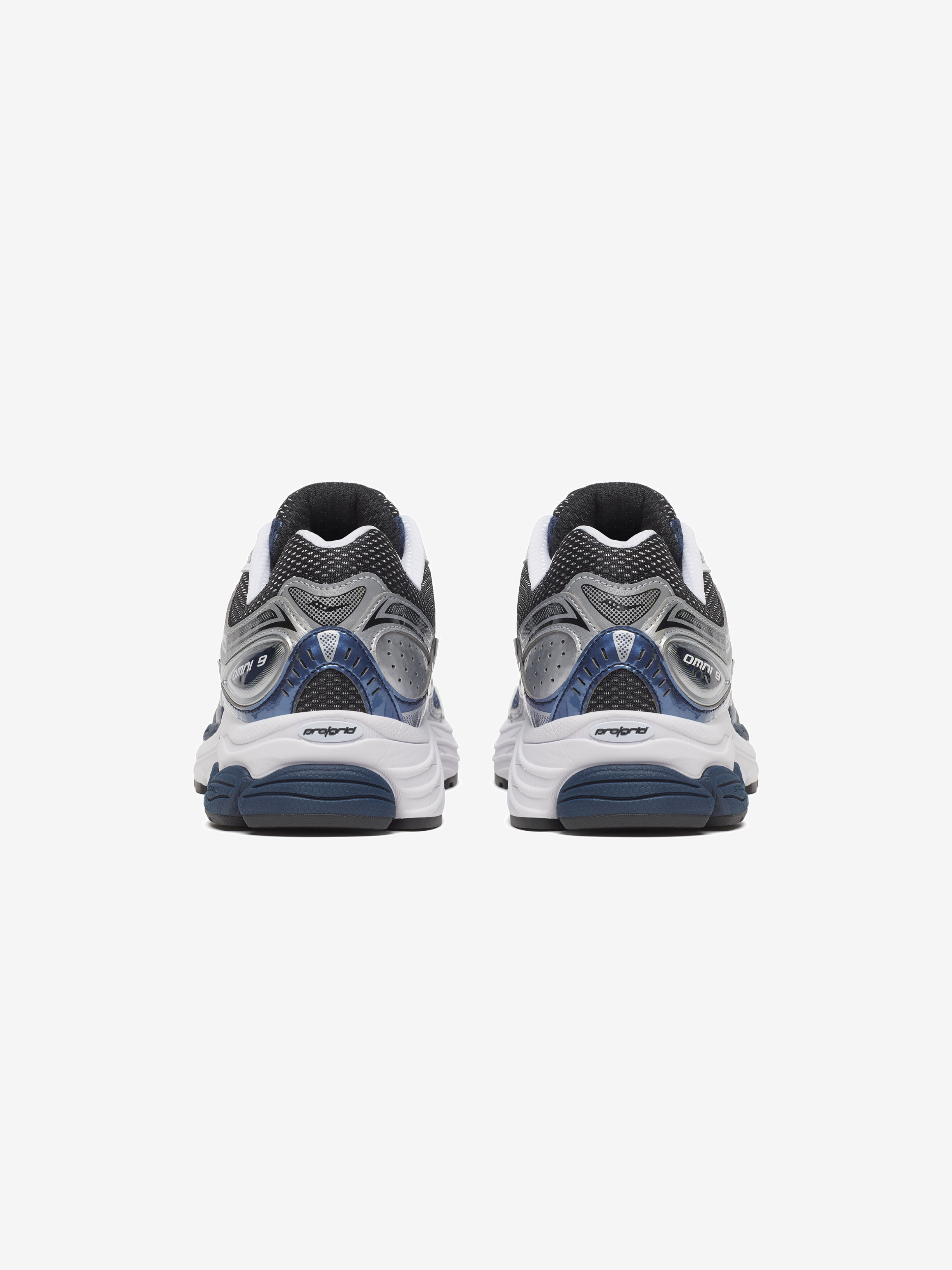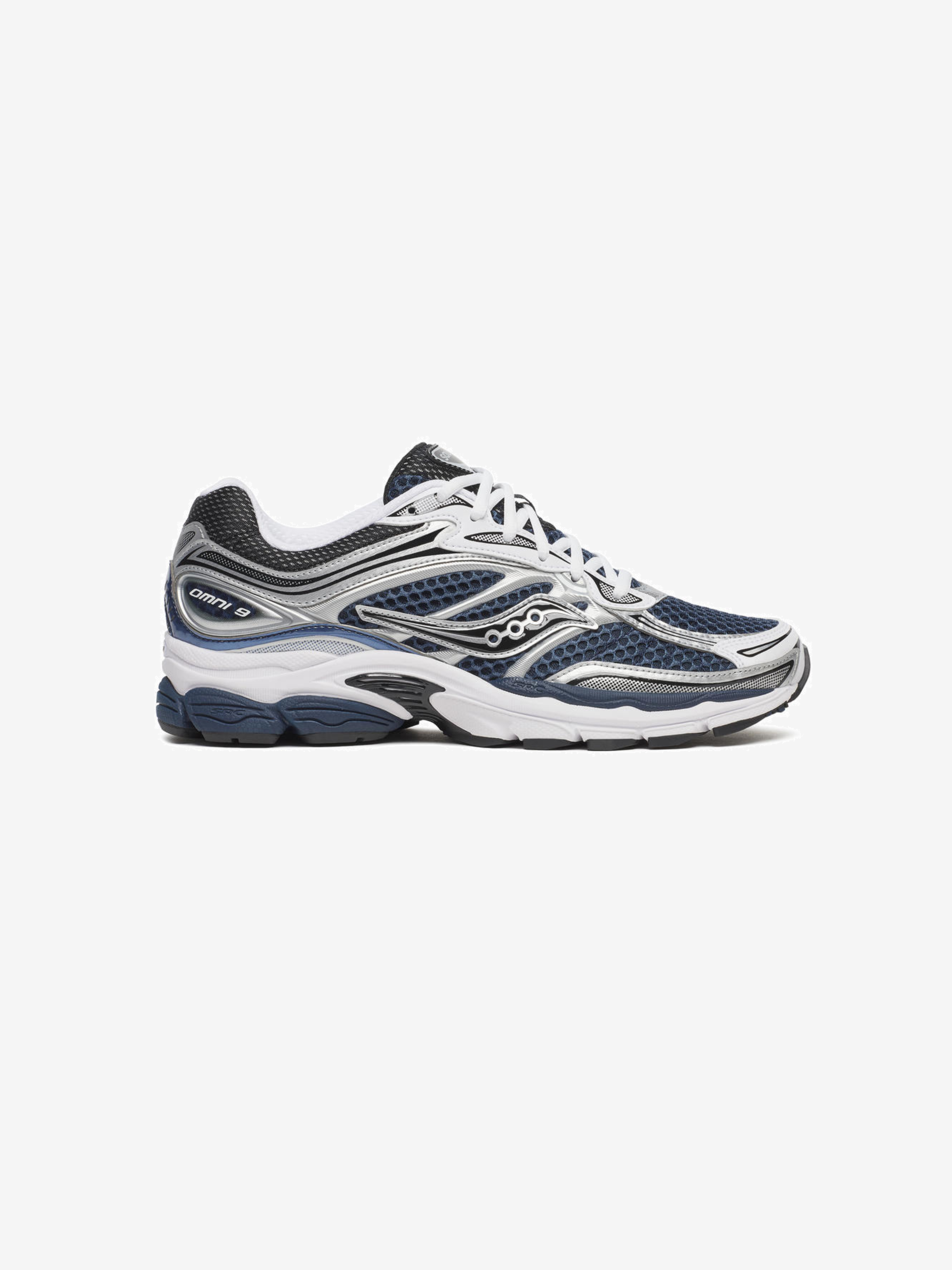 Saucony ProGrid Omni 9. This deep navy rendition arrives with leather uppers combined with mesh. Classic branding adorns the sidewalls too, while tonal midsoles compliment uppers. ProGrid tech further down gives you that stable ride, while rubber outsoles deliver sticky grip.