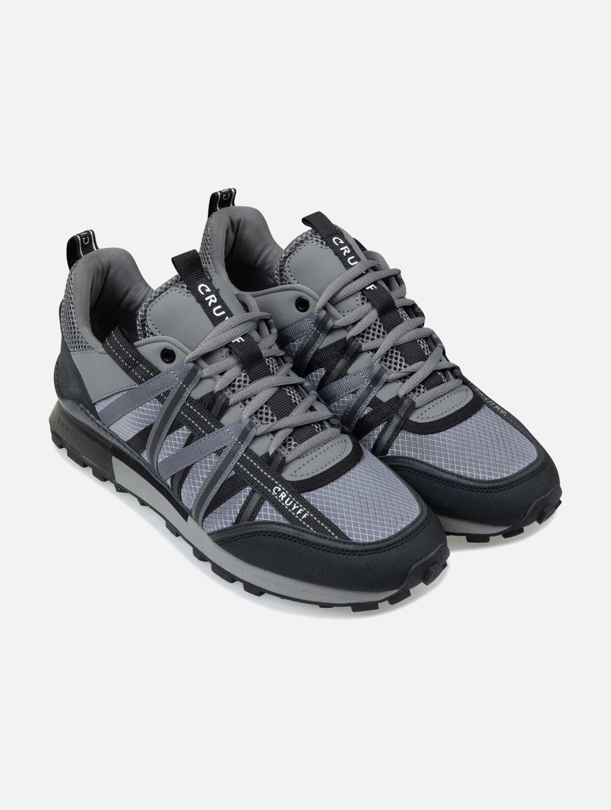 Cruyff Junior Fearia Trainers in Grey / Black.Crafted for both style and performance, the Cruyff Junior Fearia Trainers in black combine a mix of premium materials and textures. This lightweight design features an EVA midsole for cushioned comfort, complemented by hexagonal cutouts and football-style stud detailing on the sole. Finished with lace-up fastening and pull tabs at the tongue and heel for easy wear, these trainers are topped off with distinctive Cruyff logos and signature design accents.
