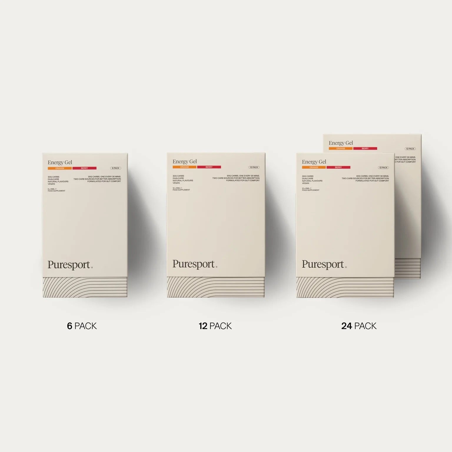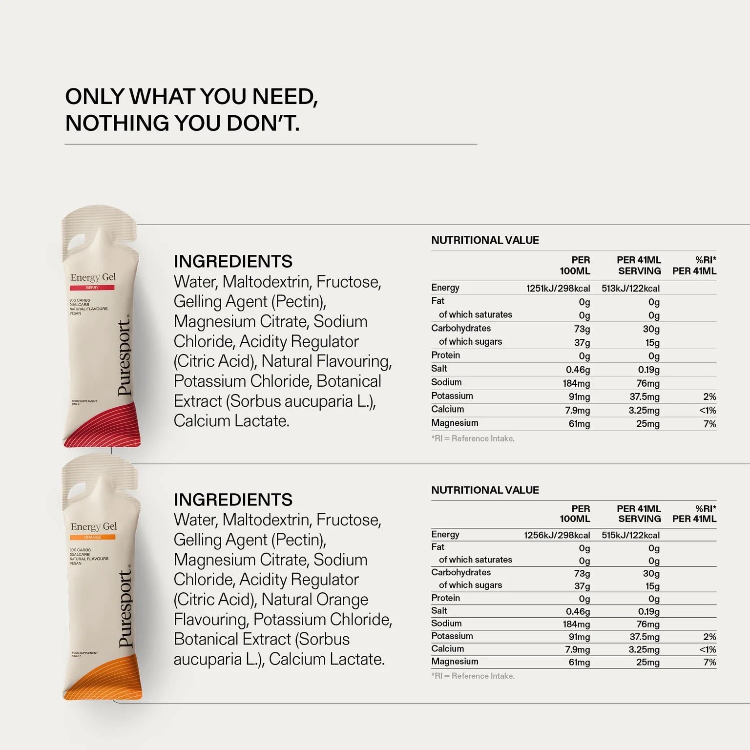 We've run the numbers for you. One gel, every 30 minutes. Puresport’s Berry Energy Gel is designed for runners and endurance athletes who want simple, effective fuelling. Each gel delivers 30g of DualCarb™ energy in a precise 1:0.8 glucose-to-fructose ratio, supporting sustained performance and reducing gut discomfort. The light berry flavour is refreshing, easy to take mid-run, and made with natural ingredients to help you fuel smarter, train stronger, and recover faster, every 30 minutes. Available in 6-pack, 12-pack and 24-pack sizes.